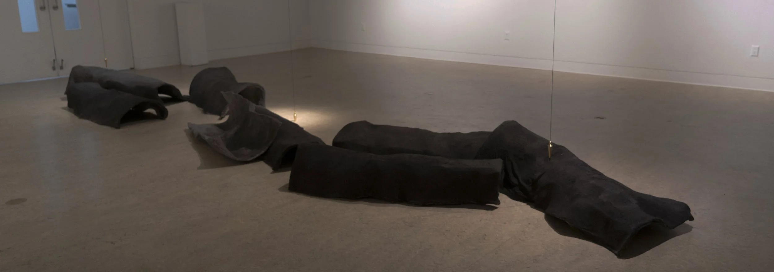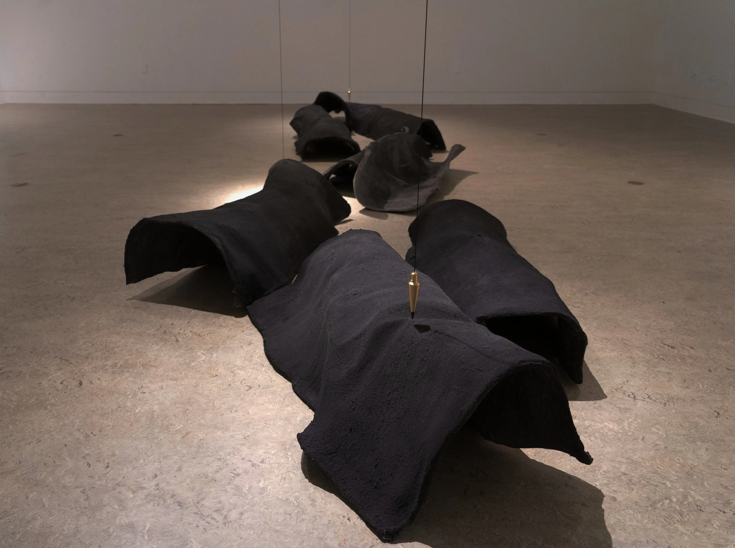 Flow State features ten concrete forms lying on the floor, each cast from the artist’s body, paired with plumb bobs suspended above to trace vertical lines in space. The grounded concrete forms carry traces of corporeal gesture, while the plumb bobs mark the invisible axes of gravity, creating a dialogue between body, space, and flow. Inspired by traditional water channels, the work transforms functional forms into an experiential system, where physical presence and spatial perception merge with historical and ecological narratives of flow.